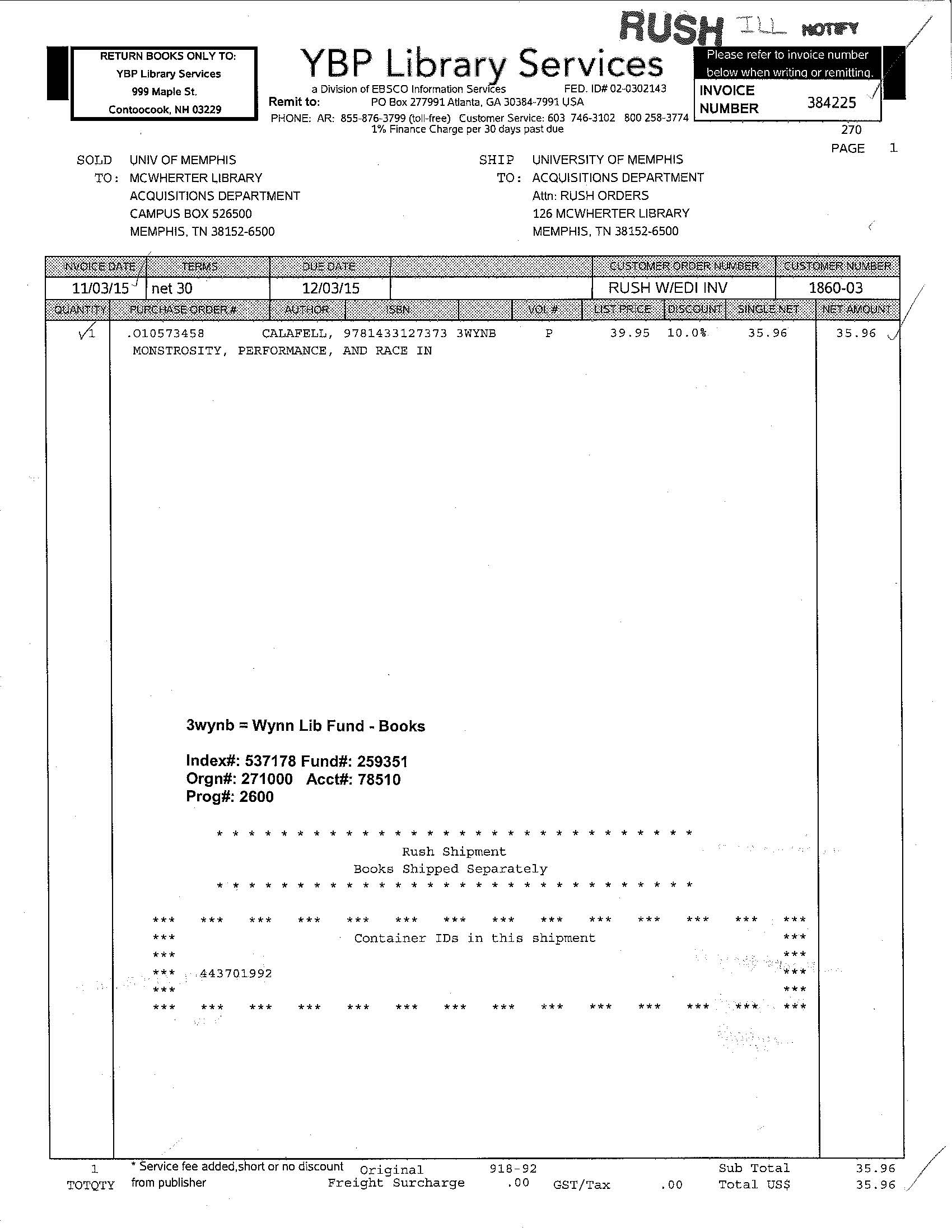 - Make sure box or package is for The University of Memphis Libraries, Collection Management/Acquisitions Dept, Memphis TN 38152.